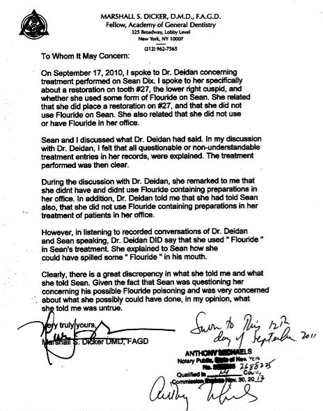 Six months after my last letter to Morgenthau in April 2009, I was poisoned at my dentist’s office. The date was 21 December 2009. I was given a syringe full of fluoride sublingually that left me unable to hold a conversation that night with a friend who had called me. I was in a fluoride induced stupor for the next 17 days. I recorded all of my calls with my dentists office beginning the next morning; I was lied to over 40 times by being told that no fluoride was used until she slipped and admitted using fluoride twice two weeks later. I have in total 17 conversations with no less that 60 confirmed lies including the “smoking gun” that fluoride had been used on me. I even saved my urine the morning after as it was the darkest urine I had ever seen in my life. It was blood I was urinating.