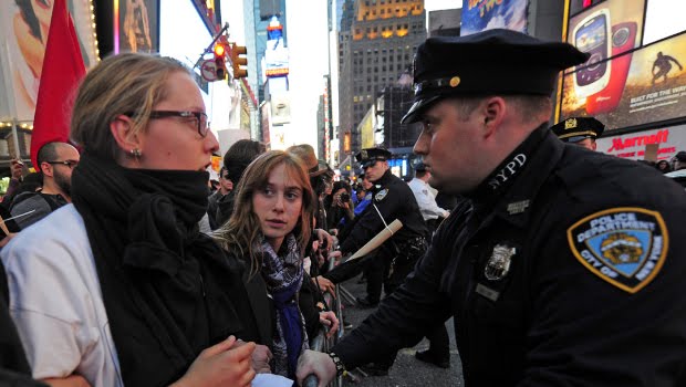 Thousands of protesters fill NYC’s Times Square 15 Oct 2011 Thousands of demonstrators protesting corporate greed filled Times Square on Saturday night, mixing with gawkers, Broadway showgoers, tourists and police to create a chaotic scene in the midst of Manhattan. “Banks got bailed out, we got sold out!” protesters chanted from within police barricades. Police, some in riot gear and mounted on horses, tried to push them out of the square and onto the sidewalks in an attempt to funnel the crowds away.