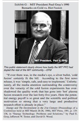 How the former President of MIT, Charles Vest, refused to order an investigation into how the Plasma Fusion Center handled the replication, and their obviously unscientific behavior — such as partying for the death of something instead of doing unbiased research. Even worse, years later he signed onto a Department of Energy report stating that cold fusion did not deserve funding for research, yet hot fusion deserved millions of additional dollars and was a “bargain.”
