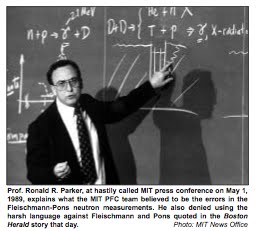 Meanwhile, when Tate’s article in the Boston Herald revealed that Parker had described Pons and Fleishmann’s work as being a “possible fraud” and “scientific schlock”, Parker rushed to deny he had made such statements. Probably, he realized that in his rush to discredit cold fusion he had crossed the line, and committed slander. In order to avoid possible legal repercussions, in a media advisory from the MIT News Office, Parker specifically denied making such assertions to Tate during their telephone conversation. However, Tate had recorded the phone call, and therefore had rock solid evidence that Parker had made those statements. Years later, Tate allowed Eugene Mallove to listen to the recording, which revealed the truth about what was said. It was too late, the damage to cold fusion’s reputation was done.