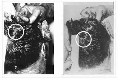 That Lifton was correct has been confirmed by David Mantik’s studies of the X-rays, which were “patched” to conceal the blow-out at the back of the head, and by my discovery that you can actually see the wound itself in frame 374 of the Zapruder film. I had speculated that, since those who were revising the film at a secret CIA photo lab in Rochester, NY, adjacent to Kodak Headquarters, “Hawkeyeworks”, might have focused so much attention on the earlier frames following frame 313 that they overlooked that it could be seen in a later frame. It was a welcome development, which I emphasized in The Great Zapruder Film Hoax (2003), but one of which Cyril Wecht appears to be similarly unaware. Consider these comparisons: