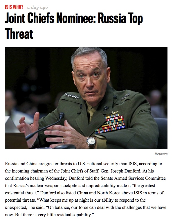 The nominee to become Chairman of the Joint Chiefs of Staff, Marine General Joseph Dunford, has advised the US Senate during his confirmation hearings that the greatest threats facing the national security of the United States are Russia, China, North Korea and ISIS. White House Press Secretary, Josh Earnest, distanced the White House from his remarks, but added Russia’s destabilizing actions in the Ukraine and “saber-rattling” over its nuclear program were worrisome: