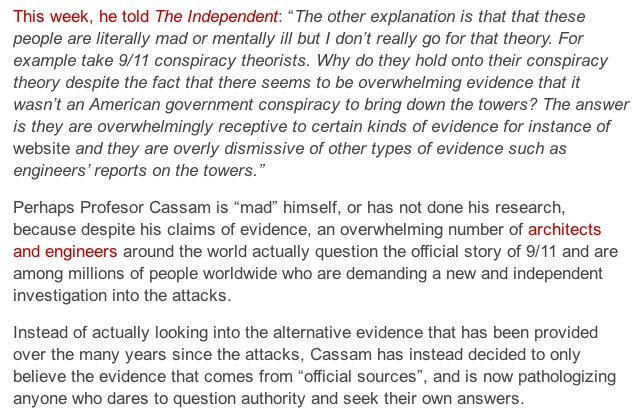 In an excellent critique of Professor Cassem’s contentions, John Vibes, “Government-Funded Study says ‘Conspiracy Theorists’ are Dangerous and could join ISIS” (1 August 2015), astutely observes in relation to his views about 9/11 that around 2,000 architects and engineers take exception to his claim that the government has explained what happened on 9/11, where they are supplemented by a large number of experts, professionals and authorities in their fields, as “Patriots Question 9/11” displays: