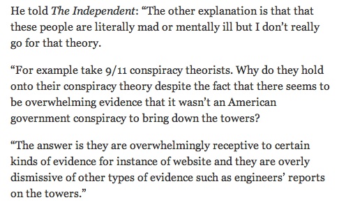 A professor of philosophy at Warwick University, Quassim Cassam, during an interview with The Independent (7 August 2015), “What turns someone into a conspiracy theorist?”, stated that he has been funded to conduct a study about why some people are more “receptive” to conspiracy theories than other, suggesting that those who are susceptible are either “literally mad or mentally ill”, where he inclines to believe they have “certain intellectual traits”, such as dogmatism, gullibility or close-mindedness, which is about as absurd as it gets. Consider: