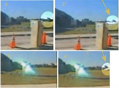 Look at the top left of this frame and you see a “cloud” and sky … where the other frames show building. Why is the ground blued up? And why is there an additional shadow in the shade of the Pentagon, not present in the other frames? (And why didn’t the tower strike create a similarly bright flash when that plane hit?)