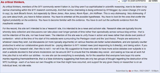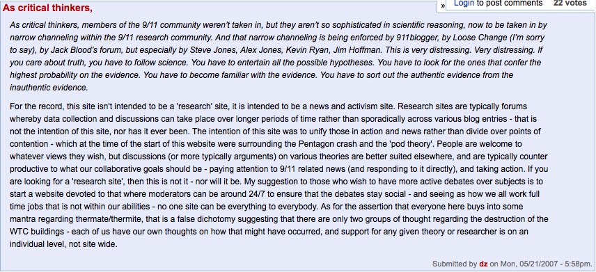 My critique of Steve Jones’ research, “On the manipulation of the 9/11 Truth Community”, in which I observed, for example, that “the most important points [he has] made are actually concessions that the evidence he has found is merely consistent with the use of thermite or thermate but doesn’t prove it was produced by thermite or thermate, where, provided that there are multiple alternative possible explanations, he has not done the job. And I’m going to claim that he has not done the job because he has a commitment to a conception of scientific method that is hopelessly inadequate. . . . And that while he talks a lot about science, he is, alas, not practicing it”, was presented on the air on on May 17, 2007. It was even published on 911blogger, but met with derision and hostility, where the comments were extremely revealing.