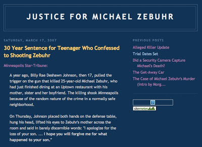 Since that was published on Friday, 15 September 2006, has something happened in the meanwhile that might have changed his mind?  What has occurred only offers further exoneration of me in relation to Michael Zebuhr’s death, including that two suspects were arrested and convicted.  They confessed to the crime.   I had not even known of Michael Zebuhr until Judy called to tell me he had been killed.  I made inquiries of the St. Paul police at the time, who assured me it was a mugging, as I have explained: