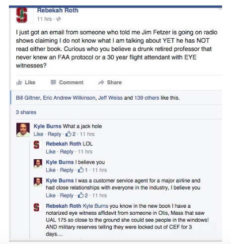 A few weeks ago, I was on a talk show and a guest called in to ask about Rebekah Roth. Knowing that she did not have everything right, I replied that I had read her book and liked a lot of what she had to say (especially in her analysis of the purported “phone calls from passengers”) but that she did not have everything right, that I had planned to compose a review of her book but had not done it yet, which I thought was a fair statement of my position about Rebakah. The next thing I knew, she had launched an attack on me from her facebook page as follows: