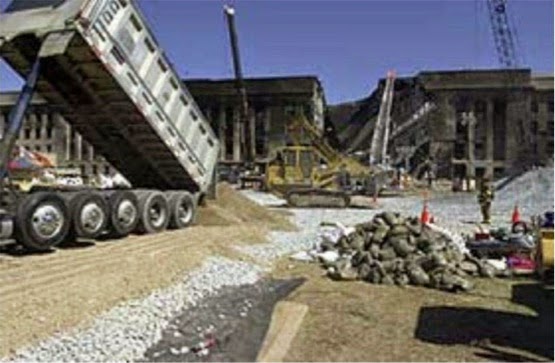 As I have stated, this indicates a penetrator warhead was used and, although I cannot pin the tail on AGM-65J with certainty, it’s inclusion in the Navy weapon’s inventory that year makes it the perfect candidate. In the below photograph, you can clearly see the use of ‘masking’ of the D.U. signature by the military having procured a huge amount of granite aggregate and other cover being laid down in the blowback area. Had an airliner been the whole gig, why would the government need to lay down rock to mask and suppress the radiation from fragments in the soil?