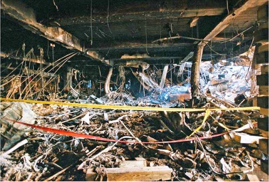 Now this photograph is the most powerful indicator to the world that the wreckage that these men advance as “proof positive” could not have been the immediate result of an aircraft impacting the building, because not a single part of the plane is visible on the lawn. So one should ask, “How did any of the purported wreckage arrive there–and why so late?” Here it is post-collapse and there is still no real wreckage yet either. Given this late photo shows virtually no wreckage from an aircraft of the kind and quantity expected–period. End of story.