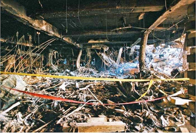 This is the source of the small amount of plane parts seen on the Pentalawn after the explosion took place. GOFER SIX was the only aircraft allowed to be in the air in the immediate aftermath of this incident and had just enough cargo capacity to air drop these small fragments seen on the Pentalawn after the above photograph with NO WRECKAGE visible was taken by a U.S. Army enlisted woman. That photograph alone proves beyond reasonable doubt that there was no aircraft impact on that building that morning. There was no wreckage 9 minutes later. Notice the arrival of wreckage is evident here, when it was not there in the earlier shots: