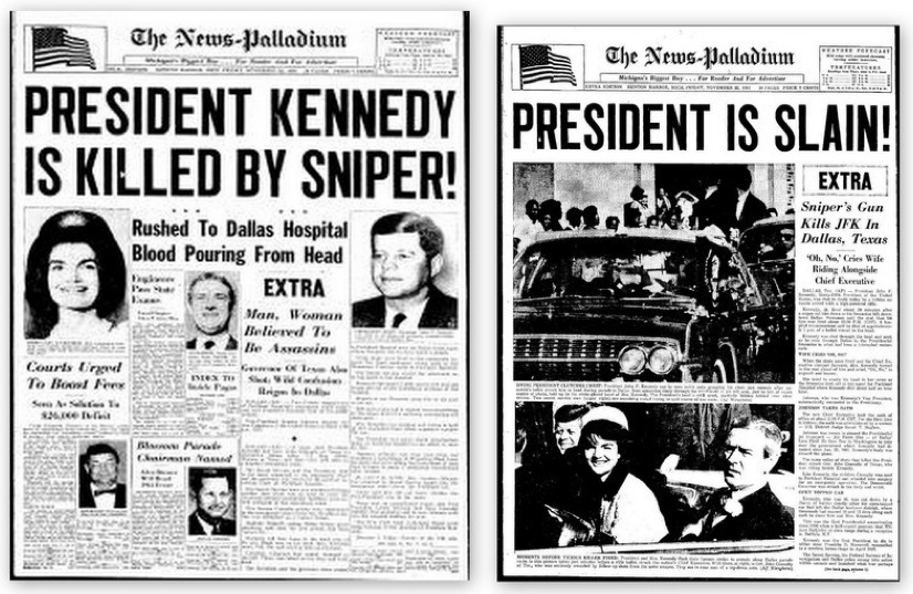 Here are the real and fake editions of the Benton Harbor News-Palladium (where Benton Harbor is a small community in Michigan of then-about 10,000 population) published their own bona fide issues that Friday, which were replaced by fake issues to create the false impression of having included the Altgens6: