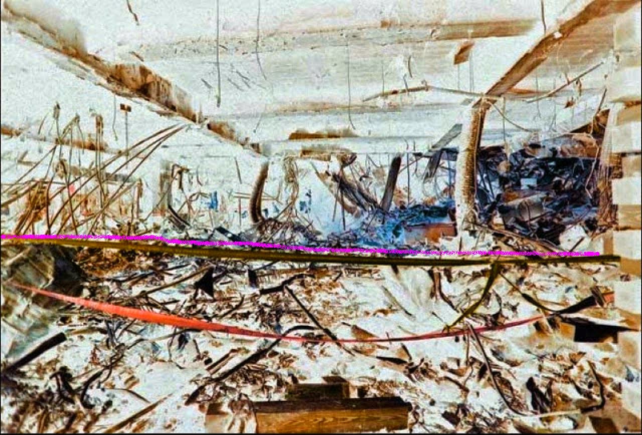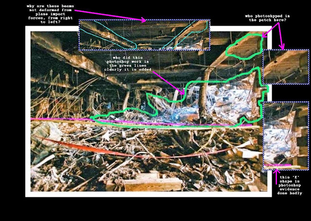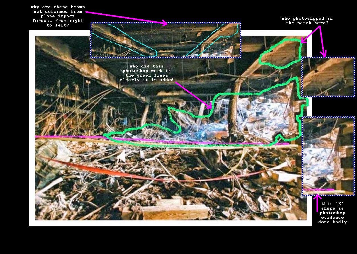 Even closer examination in the debris field mostly in the upper half shows demarcation lines of cut and paste having been performed in more than one area inside it.  In his original upper ceiling beam (left-hand side), you can see where they pasted in over the beam to obfuscate something that happened on the beam itself in an attempt to hide that from us.  The shading of the reverse “E” area shows, beyond any doubt, that this photo was heavily retouched and altered.