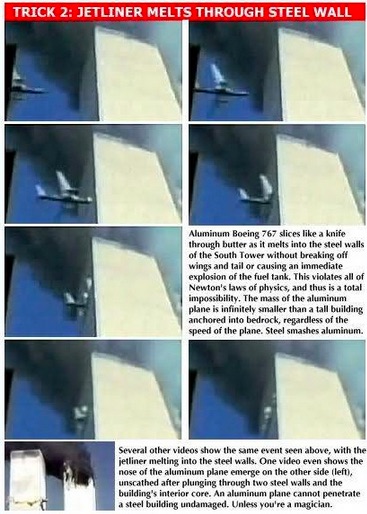 No real plane–commercial, military or otherwise–could enter a steel and concrete building in violation of Newton’s laws, pass through its own length into the building in the same number of frames that it passes through its own length in air, and not have its fuel explode as it makes contact with that massive edifice. Even the frames from the Pentagon show a huge fireball upon impact. If that was true of the 757 there, why is it not also true of the 767 here? And no real plane could have passed through and its nose come out the other side. It looks as though the fabrication of Flight 77 fakery was just a bit better than the fabrication of Flight 175 fakery. But both involved massive fraud and deception.