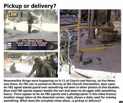 Since this is the wrong engine component and was off-loaded as a prop, how can anyone be so gullible as to believe that it supports the official account, especially when its under a steel scaffolding and sitting on a sidewalk, where if something that massive had hit there at high velocity (having come from the South Tower as alleged), it would have been buried half-way into the concrete, not sitting on top of it? There is even a dolly present, which–although not heavy-duty–may have played a role in moving it from the white van to its location on the sidewalk. This a blatant case of deliberate deception and fakery that completely vitiates the official account.
