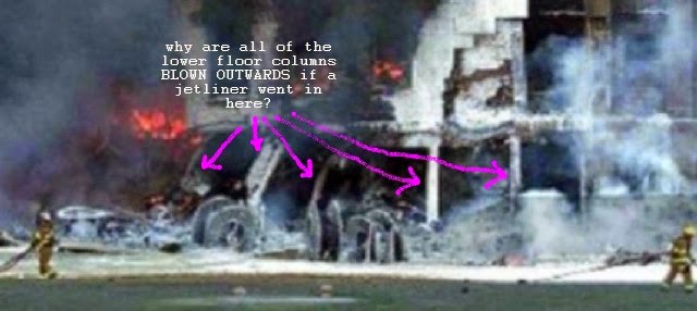 Since these fire trucks arrived after the crash and spent fifteen minutes or so putting it out, I have been struck by the clear, green, unblemished Pentagon lawn. There is no indication that a Boeing 757 hit the building–NONE! Nor in any of the other photographs we have featured about the Pentagon. And, as Dennis Cimino has observed, if a plane had flown into the building, then why are these supports blown outward? No plane hit the building.