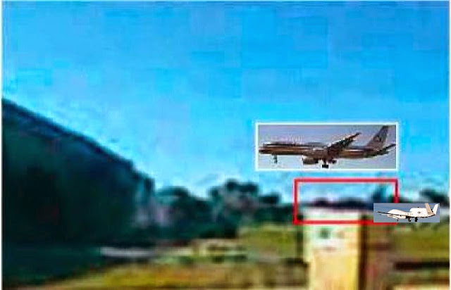 When the image of a Boeing 757 is sized to the tail of “the plane”, it turns out to be more than twice as long as what the frame shows, which means it cannot possibly be a Boeing 757. But, as Dennis Cimino has observed, it could have been a Global Hawk, which may have fired a missile into the building, where the white plume is not from the exhaust of any jet engine but from the solid-propellant engine of a Maverick. The fragile composition of the Global Hawk would have made it an ideal delivery system, since it would have been obliterated into tiny parts upon impact with the Pentagon.
