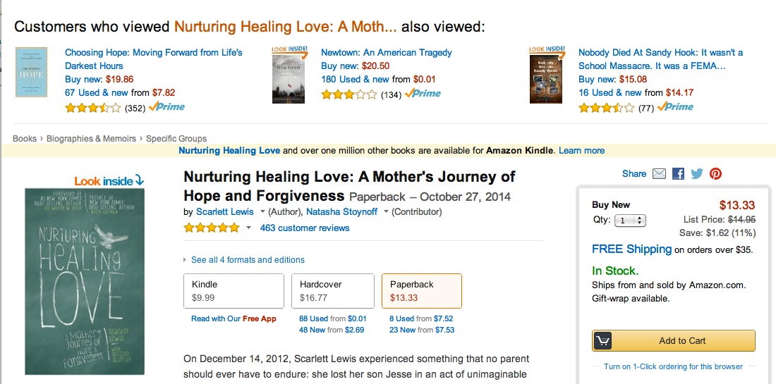 This afternoon, I received a request from Alison Hall with INSIDE EDITION (ABC daily, early evening in most cities). She said they were doing a story about NURTURING AND HEALING (2014) by Scarlett Lewis, one of the purported parents of a child, Jesse Lewis, whom the “official reports” allege to have been killed by Adam Lanza. Apparently, they noticed that amazon.com advertises NOBODY DIED AT SANDY HOOK (2015) on the same page as Scarlett’s book, which led them to contact me to discuss what we had found.