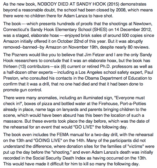 The book “Nobody Died at Sandy Hook” by Jim Fetzer, et al was published and for sale on Amazon.Com for about a month before it was banned by CEO Jeff Bezos. Then the authors made it available for free on the site rense.com and others. This has been publicized for over a month since the banning by Amazon. While the only people who could prove that the editors and writers of the NY Times, Harford courant, Sun Sentinel, NYPost, AOL, NBC and other news outlets had read this book would be a US Attorney questioning these people under oath, it is very likely all of them have downloaded the free copies available for this book, along with the millions of others reported to have done so, and read every word of it. Yet they obviously are bending over backward to avoid even referencing it, let alone discuss all the many contradictions this book poses for the official lies of Sandy Hook by government at every level, federal, State of Connecticut and Newtown Connecticut. These news outlets have a basic responsibility to the public to promote the public interest and that does not mean deliberately lying to the public about crimes of its own government. But that is exactly what is and has been going on here. The whole reason this book was produced was exactly because those responsible for properly and honestly investigating the events at Sandy Hook School Dec. 14, 2012, failed to do so. They are still failing to do so. The best result that would happen now would be a full blown public discussion of the book. Winfield J. Abbe, Ph.D., Physics