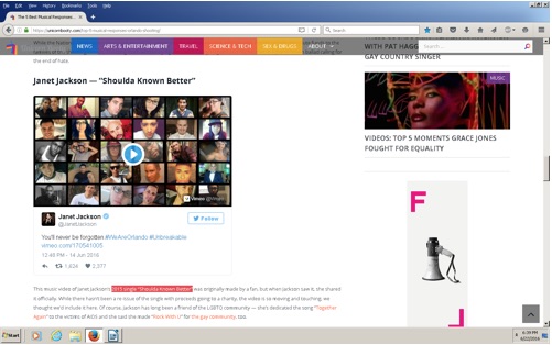 In 2015 Janet Jackson released her single “Shoulda Known Better”. When an unnamed fan made a video for her song using footage and images from the Orlando Shooting Janet Jackson stated that it touched her heart so much that she just had to post it on You Tube for all the world to see. According to You Tube, the video was posted on June 15th, 2016. When you watch the video you will hear and see media reports and interviews with victims families along with still photos, including various candlelight vigils taken in the days following the shooting.