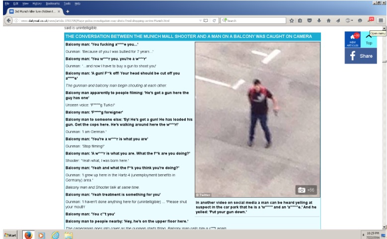 The day following the shooting we were told that the suspect had been identified as an eighteen year old German-Iranian man by the name of Ali David Sonboly. He was described as a friendless loner who had been bullied in school. He was obsessed with school mass shootings, which police said was likely one of the motives for his actions. In addition, we were told that he spent the majority of his time playing violent video games. Most unbelievable too was that Sonboly was said to have hacked a young girl’s Facebook account where he then posted a message to lure people to the McDonald’s by offering to pay for their food. Seriously? Ask yourself if that sounds logical.