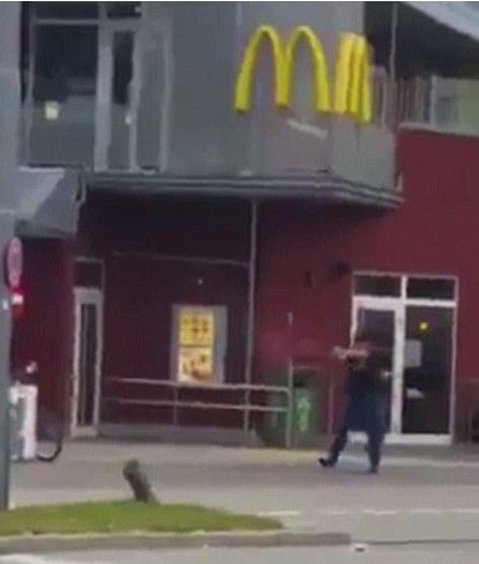 We were told that victims were shot and killed by the alleged shooter inside and outside of this McDonald’s. What we should see here is police tape to block public access to the crime scene. Also, the gunman fired several rounds of ammunition from his semi-automatic handgun, but we see no evidence markers showing investigators the location of spent shell casings and other pieces of evidence. Lastly, although we were told that victims were shot at this location, we see no evidence of blood on the pavement, no damage to the building or immediate area, no broken windows, etc. Again, if multiple victims were shot there would have been blood at the scene.