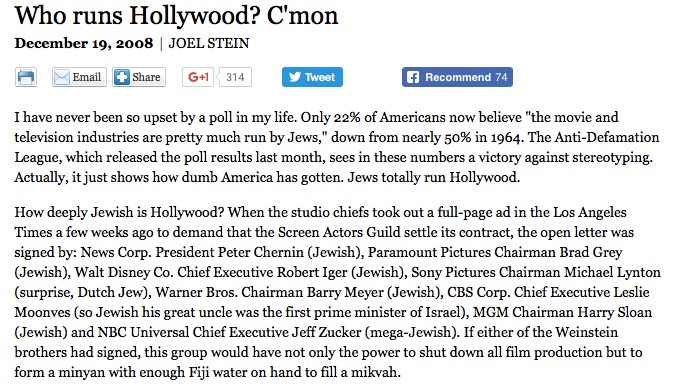 Check it out. “Who runs Hollywood? C’mon” (19 December 2008). does that mean Joel Stein is anti-Semitic? To the best of my knowledge, not a peep of protest was raised when it was published, because everyone in Hollywood knew that it was true. He listed all the studio producers as evidence. Do a search on-line. Does truth matter? Where do we draw the line between truths about people and anti-Semitism?