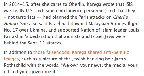 An article, “Changing Course on Anti-Semitic Remarks”, Inside Higher Education (7 March 2016), reports that Oberlin has altered its stance regarding comments made by Assistant Professor, Joy Karega, on her Facebook page, where she wrote that ISIS was the creation of US and Israeli intelligence and that they were behind the attacks on Charlie Hebdo.