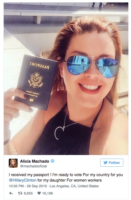 Hillary said that Machado (Miss Venezuela) has since become a U.S. citizen and would take revenge on Trump by voting for Clinton.