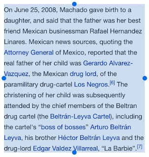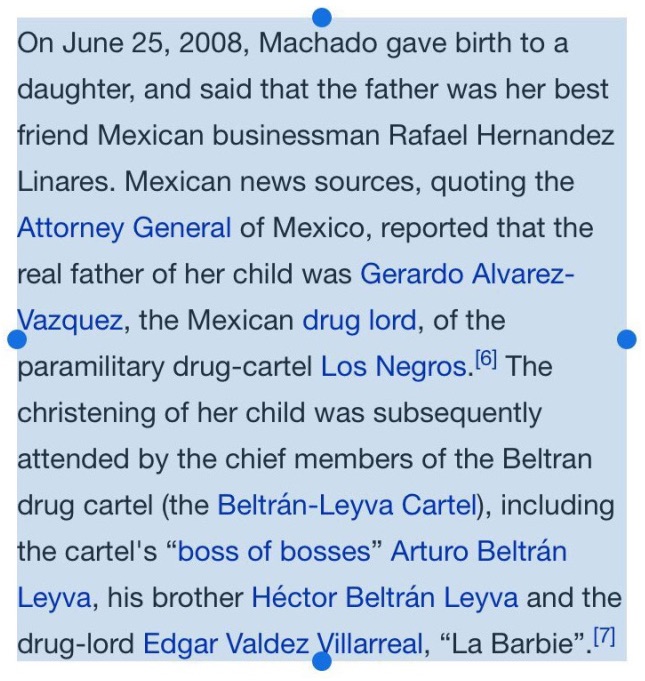 “On June 25, 2008, Machado gave birth to her daughter, Dinorah Valentina. She issued a statement that the father of Dinorah was her best friend Mexican businessman Rafael Hernandez Linares after Mexican news sources, quoting the Attorney General, reported that the father was Gerardo Alvarez-Vazquez, a drug lord.”