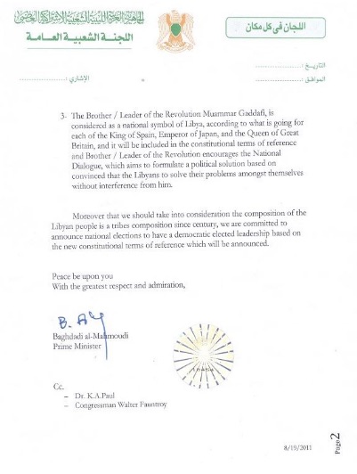 Under the terms of the deal, detailed below in an official letter signed by Prime Minister Baghdadi al-Mahmoudi on August 19, 2011, Gaddafi agreed to cease hostilities and immediately move towards holding democratic elections that would put an end to his own 42-year dictatorship.
