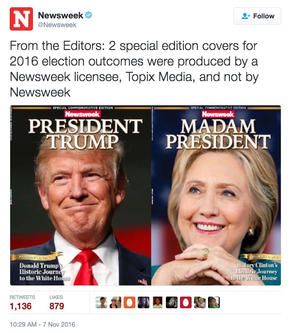 “It’s embarrassing. Let me tell you how it happened, and what we’re doing to make sure it doesn’t happen again. Newsweek, like a lot of publications, puts out special commemorative issues . . . these are big parts of the magazine business. What we did for the election was the company that we subcontract to . . . produced two editions: One, ‘President Trump’, and ‘Madame President’. They both . . . the ‘Madame President’ one mistakenly went out, which was the first embarrassment, it should never have happened. But it can happen . . . not up to our editorial standards. . . . No one on our staff wrote it, we subcontracted it out . . . [no one] read it before it went out . . . . You see, we subcontract these commemorative issues out to a company. This is pretty common in the magazine business . . . . It’s sort of been done on a separate track, and we did not review it before it went out.“