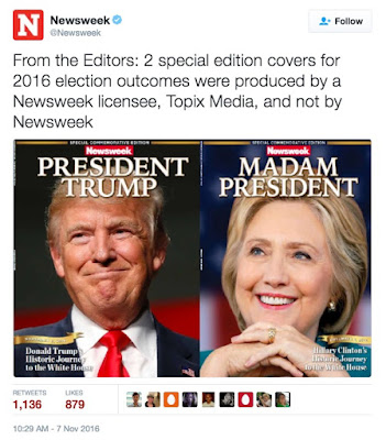 From the Editors: 2 special edition covers for 2016 election outcomes were produced by a Newsweek licensee, Topix Media, and not by Newsweek