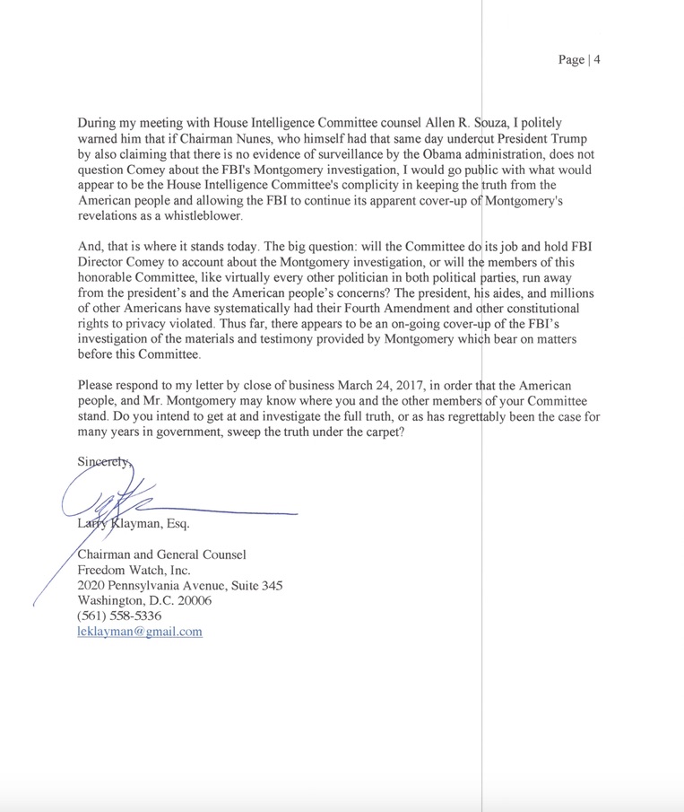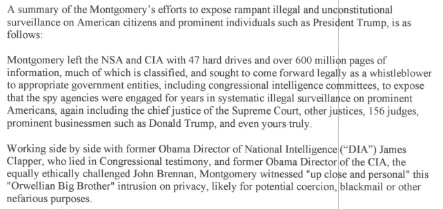 Klayman requests the Committee require James Comey, Director of the FBI, to return for additional questioning about what he knows about these matters on 28 March 2017, where his testimony on 20 March 2017 appears to be inadequate. It appears to me that these revelations are going to create a sensation as they become more widely known and that Montgomery will join the Pantheon of true heroes of the American people–along with Edward Snowden and Julian Assange–who have placed themselves at risk on behalf of the best interests of the citizens of the United States and of Constitutional government. (Click on each page to make its contents fully readable.)
