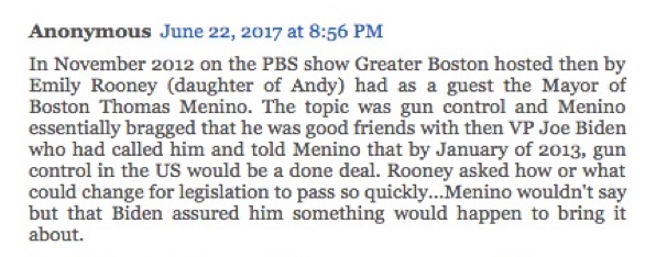 As the book explains, Eric Holder visited with Gov. Dannel Malloy on 27 November 2012, during which he appears to have informed him that they were going to take an abandoned school, conduct a drill and present it as a LIVE event to promote gun control. On 16 January 2013, Obama signed 23 executive orders to limit access to weapons under the 2ndAmendment. Joe Biden seems to have confided in the Mayor of Boston, Thomas Menino, that, “by January 2013, gun control in the US would be a done deal”: