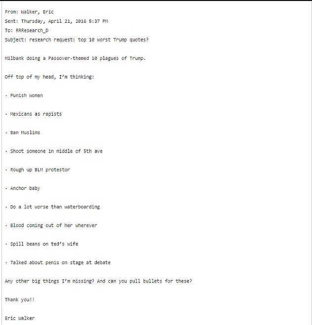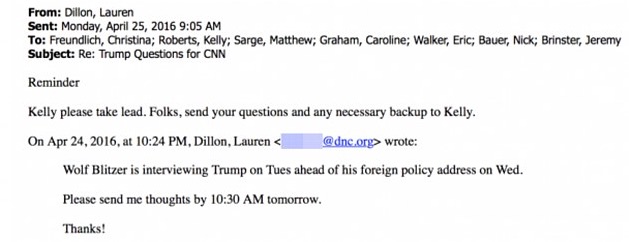 Yet will CNN spend 90 percent of it’s air time reporting on an actual collusion? So far, they haven’t spent a single second. A Separate DNC email chain found appears to show Washington Post columnist Dana Milbank asking the DNC for help with research for a column The column he wrote was about Trump and featured a list of things the presidential candidate said that he deemed as ‘outrageous’. ‘Wolf Blitzer is interviewing Trump on Tues (sic) ahead of his foreign policy address on Wed,’ DNC research director Lauren Dillon wrote in the email that was entitled ‘CNN questions for Trump.’ Numerous questions were submitted by a group of DNC staffers and officials for Blitzer to ask Trump.
