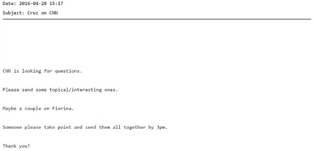 An email dated April 28th entitled ‘Cruz on CNN’ reads: “CNN is looking for questions. Please sent some topical/interesting ones.”