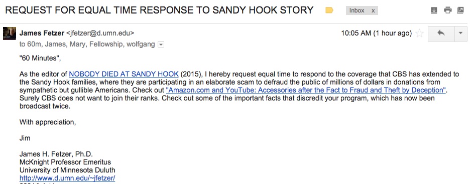 I have now written to request “equal time” to respond, where I would judge the probability of a positive response to be on the order of the probability of 20 Sandy Hook mothers having given birth at the average age of 36! The kids were fabrications from photos of children when they were 10 years younger. Here’s what I have submitted to “60 Minutes”: