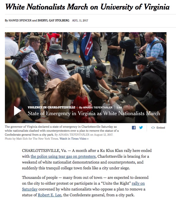 Because as I see it, when the President, the Provost, the Vice-Provost and 75 members of the Department of History have been provided verifiable proof that the Charlottesville event–which even The New York Times characterized as “White Nationalists March on the University of Virginia”–and they do nothing to set the record straight, they have not only betrayed the institution but the nation at large.