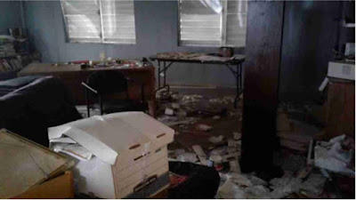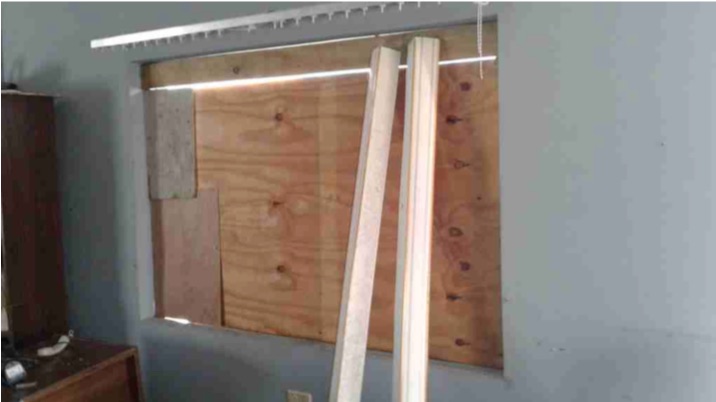 This window shattered and allowed the wind and rain to trash my office. We quickly covered it with plywood: