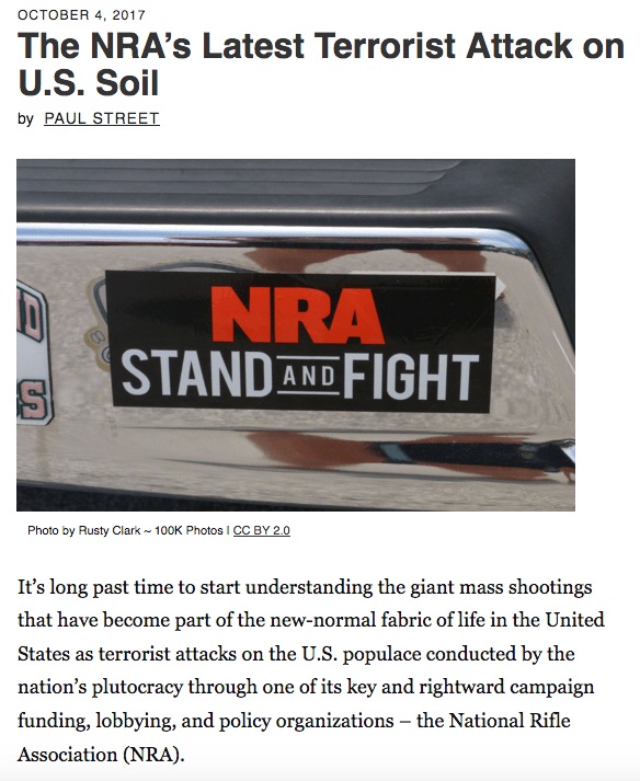 And it is not only the authorities and the presstitutes that truth is up against. There is also the lack of integrity in people with axes to grind. For example, Paul Street writing in CounterPunch says: “The Las Vegas massacre is just the latest in the Gun Lobby’s long line of terrorist attacks on U.S. soil.” The article is titled: “The NRA’s Latest Terrorist Attack on U.S. Soil.” You can read it here.