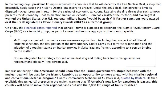 Rumor has it that Trump met with Sheldon Adelson shortly after the Las Vegas attacks to discuss “policy!” Everyone knows Adelson wants Iran bombed back to the Stone Age in support of Israel. This alleged meeting only adds to the perception that Trump’s intent to reject the JCPOA benefits Israel and not the US!