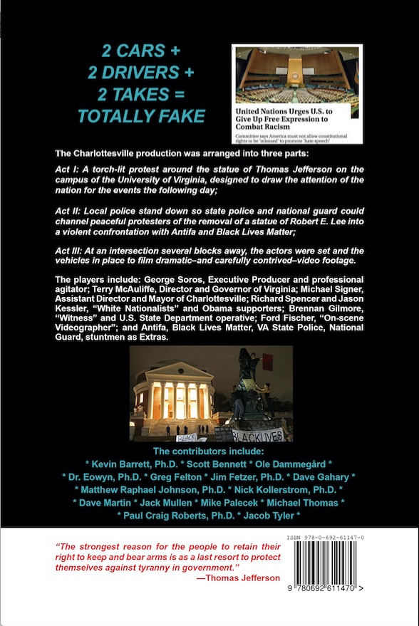 The key players in this staged event turned out to be George Soros, who financed the event, Executive Producer; Terry McAuliffe, Governor of Virginia, Director, who controlled the National Guard and the VA State Police; Michael Signer, Mayor of Charlottesville, Assistant Director, who ordered the local police to stand down; Richard Spencer and Jason Kessler, who impersonated White Nationalist leaders to give the event a neo-Nazi flavor; Brennan Gilmore, a U.S. State Department operative who appears to have served with the CIA in Africa, Witness; Ford Fischer, as the On-scene Videographer; with Antifa, Black Lives Matter and stuntmen asExtras.