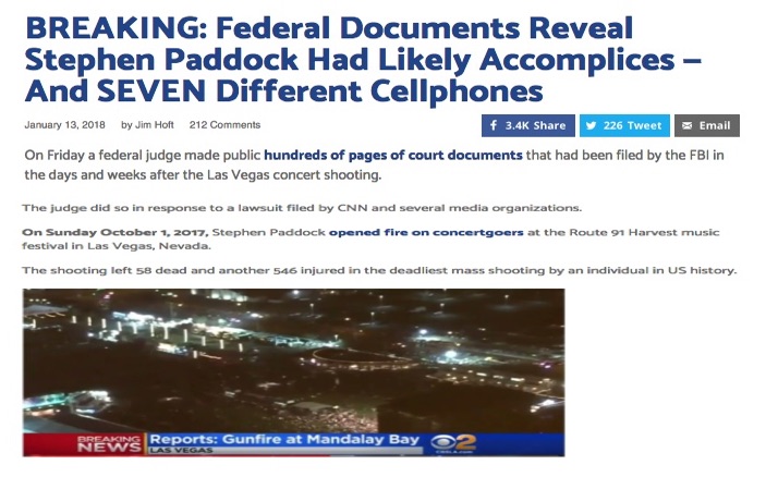The deadliest mass shooting in modern U.S. history was blamed on one man within hours, and the FBI has consistently claimed that Paddock was a “lone wolf” shooter who intentionally transported an arsenal of guns, ammunition, and supplies to his hotel room on the 32nd floor of the Mandalay Bay Hotel, and then unleashed barrage of gunfire from the bedroom window that killed 58 people and injured more than 500.