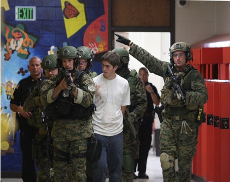Pictured: Suspect (high school junior Brett Harvey, 16) under arrest in a simulation after a long ordeal.