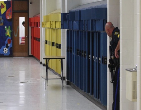 Pictured: Standoff – first arriving local cop Sgt. Michael Jenkins peers at cornered ( but holding hostages ) suspect down in the art room.