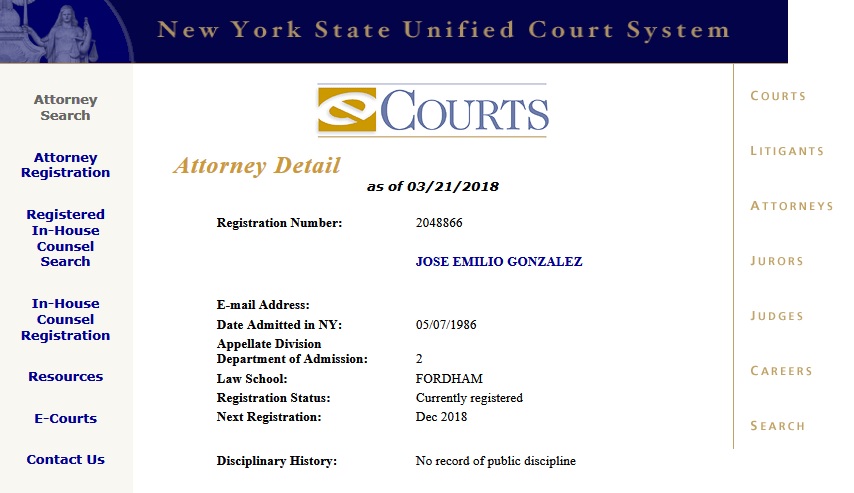 Furthermore, JEG is listed as a registered member of the New York State Bar, in good standing and with no disciplinary actions against him in the past. He was admitted in 1986 out of Fordham Laws School and his "Disciplinary History" is this: "No record of public discipline". If he has been convicted or even accused of the crimes in question, then he would certainly have been reprimanded, suspended or disbarred by the NY State Bar. What gives?