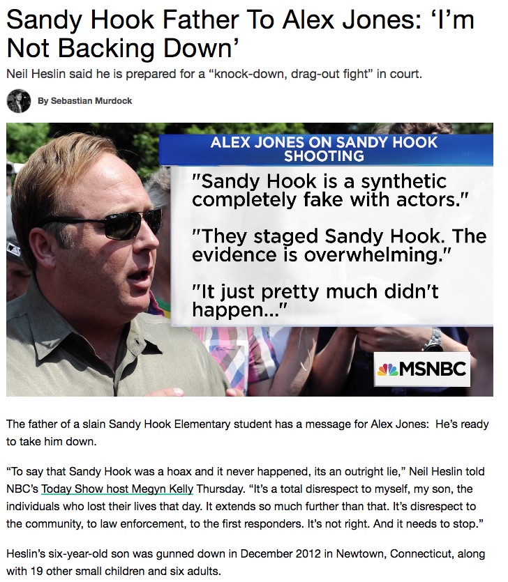 Sensing weakness–since truth is an absolute defense against defamation, but Alex is not arguing that his observations about Sandy Hook fakery are true–Lenny Pozner and Neil Heslin are not going to back down, even though they are (in the process) opening themselves up to discovery, which would provide an opportunity to establish the fact of Sandy Hook as an elaborate charade in a court of law. Neil Heslin, for example, longs for “a knock-down, drag out fight”, which Alex ought to give him: