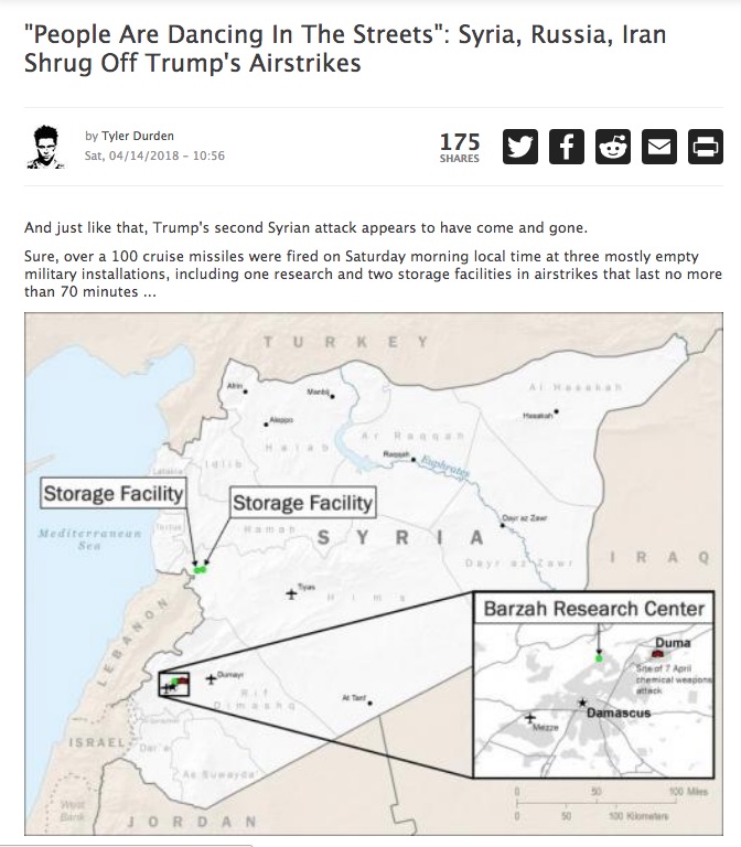 Jim, I think yu underestimate the degree of coordination between Putin and Trump against their deep state common enemy. As with the previous false flag, nobody was killed by the missile strike and no significant amount of damage was done. It was Kabuki theatre. The OPCW is inspecting Douma today. Meanwhile, the real perpetrators, namely the British, are being exposed like never before as liars by the OCPW report on the Skripal poisoning.