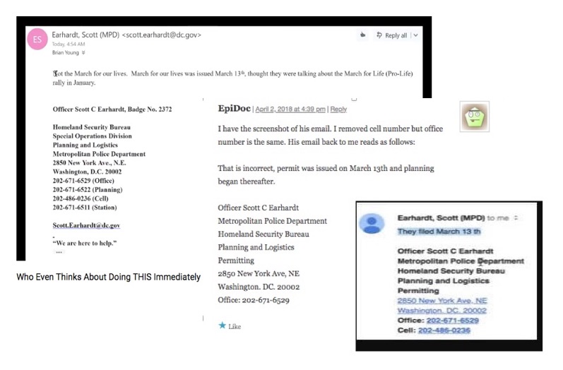 And I am not alone in my belief, where many others with planning experience have affirmed the same. As you may have noticed, Officer Earhardt claims that he confounded “March for Our Lives” in March with “March for Life” in January. But that is completely ridiculous, since in the original email he identified the event as “the March For Our Lives Demonstration, here in the District of Columbia on March 24, 2018”. He therefore knew at the time exactly which event he was addressing–and it was not March for Life on 16 January 2018!